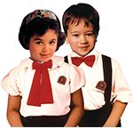A bow and a badge with white socks and black shoes completes this smart outfit.